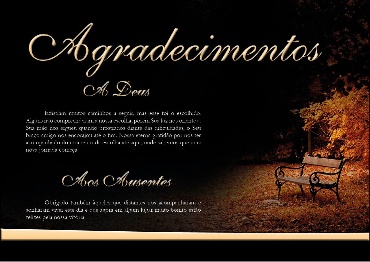 Outra parte importante são os agradecimentos, Inicialmente a Deus, aos ausentes, aos pais, aos que amamos e por fim aos mestres.